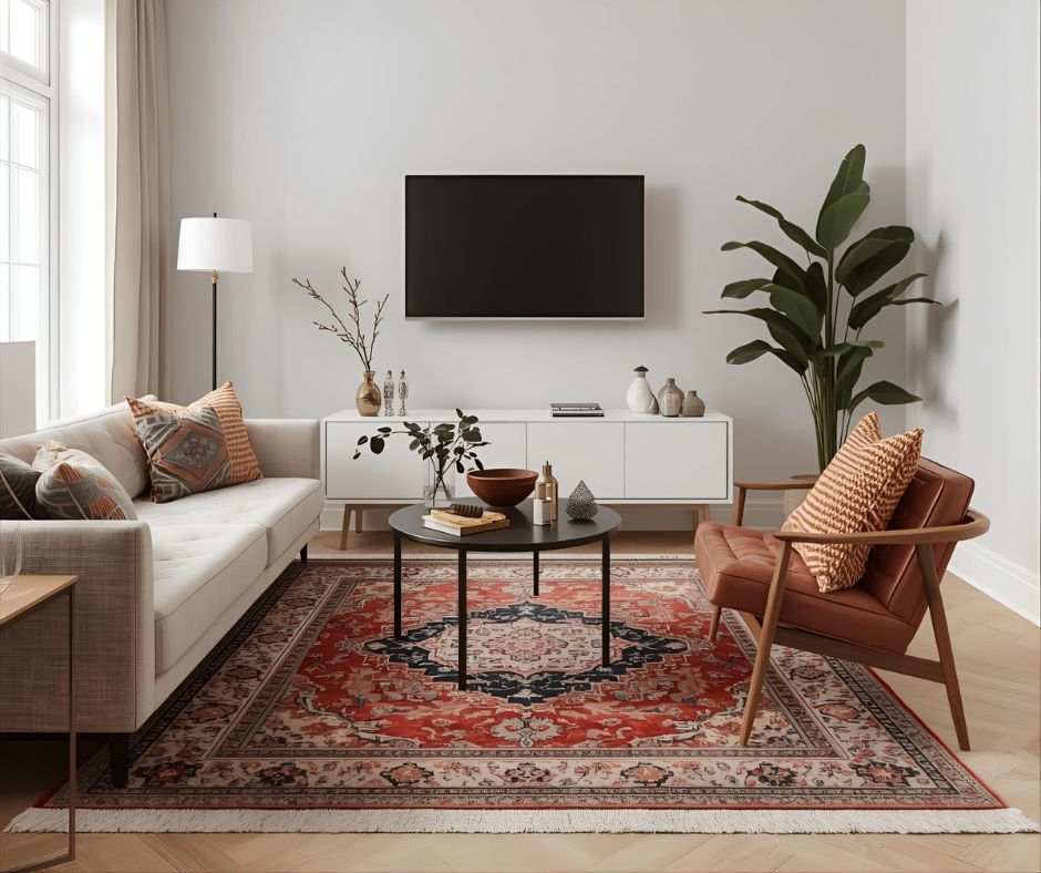 Μοντέρνο στυλ διακόσμησης: Επιλέγουμε μίνιμαλ έπιπλα με καθαρές γραμμές και ουδέτερα υφάσματα. Αυτή η λιτή προσέγγιση αναδεικνύει το χαλί και είναι ιδανική αν θέλουμε να έχουμε ένα μοντέρνο στυλ διακόσμησης.